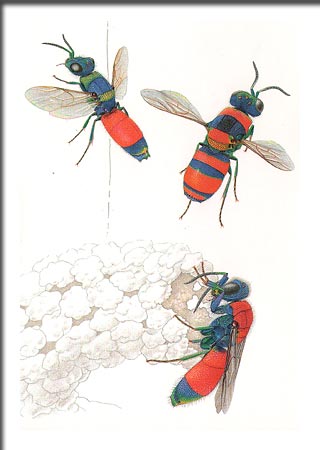 Goldwespen oben links: Chrysis rutilans rigiana oben rechts: Chrysis semicincta unten: Chrysis viridula 10.5 × 15 cm Preis (ohne Rahmung): CHF 2.–