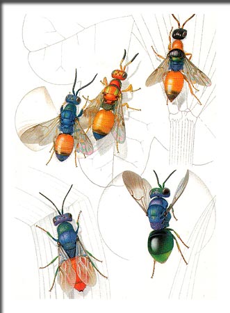 Goldwespen oben links: Cleptes semiauratus oben rechts: Cleptes nitidulus unten links: Omalus panzeri unten rechts: Omalus aeneus 10.5 × 15 cm Preis (ohne Rahmung): CHF 2.–