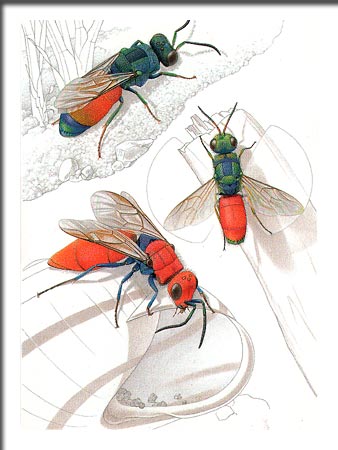 Goldwespen oben: Euchroeus fahringeri Mitte: Chrysis gracillima unten: Chrysis cuprea 10.5 × 15 cm Preis (ohne Rahmung): CHF 2.–