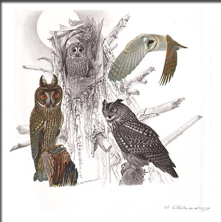 Waldohreule, Schleiereule, Waldkauz, UhuTiere der Eifel Offset 1976 Preis (ohne Rahmung): CHF 300.–