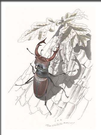 Hirschkäfer Lithografie handkoloriert 1990 Büttenpapier 40 × 50 cm Preis (ohne Rahmung): CHF 1'000.–