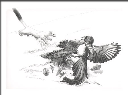 Elster und Hermelin Lithografie ohne Kolorierung 1980 Büttenpapier 45 × 38 cm Preis (ohne Rahmung): CHF 800.–