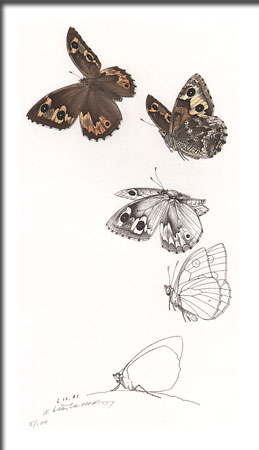 Feldnymphe (Weibchen)(Hipparchia semele L.) Lithografie handkoloriert 1985 Büttenpapier 40 × 50 cm Preis (ohne Rahmung): CHF 1'000.–