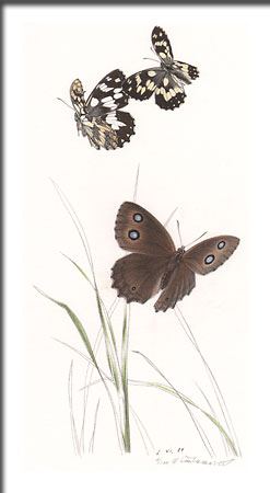 Damenbrett(Melanargia galatea L.)Grosse Waldnymphe (Weibchen)(Minois dryas Scop.) Lithografie handkoloriert 1984 Büttenpapier 40 × 50 cm Preis (ohne Rahmung): CHF 1'000.–