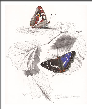 Grosser Schillerfalter (Männchen u. Weibchen)(Apatura iris L.) Lithografie handkoloriert 1984 Büttenpapier 40 × 50 cm Preis (ohne Rahmung): CHF 1'200.–