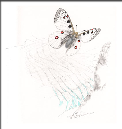 Hochalpenapollo Lithografie handkoloriert 1985 Büttenpapier 40 × 50 cm Preis (ohne Rahmung): CHF 1'000.–
